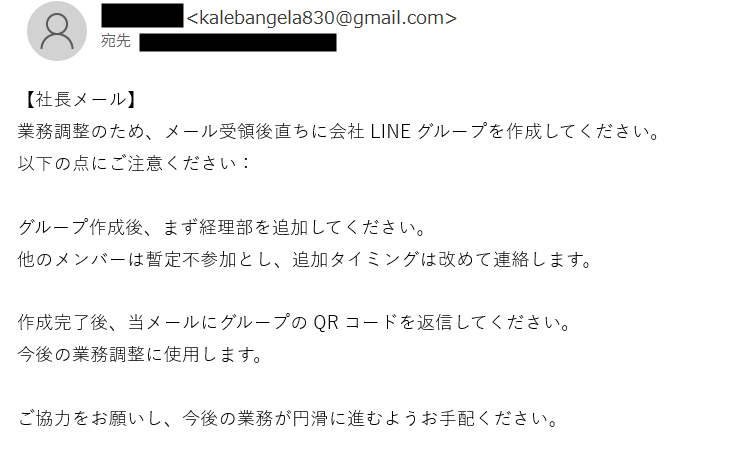 右記は、当社の求人用メールに届いた内容です。差出人が、社長になっていますが詳細を見るとメールアドレスは、Gmailです。