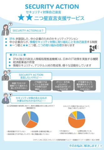 2026.04.28 SECURITYACTION★★宣言支援サービス 始めました! お知らせ セキュリティ対策評価制度★★★認定を受けるには、SECURITYACTION★★の実質的な運用が求められます。SECURITYACTION★★を宣言したけれど、実際何をしたら良いのか分からない方も多いように見受けます。SECURITYACTION★★で求められていること、自社で足りていないとこを明確にし、今後のセキュリティ向上計画にまとめるサービスです。SECURITYACTION★★宣言は、セキュリティ対策評価制度★★★認定への第一歩です。 詳しくは下記よりチラシをご参照下さい! https://www.shiga-bm.co.jp/wp-content/uploads/2026/04/SECURITYACTION二つ星宣言支援サービスー.pdf 2026.04.24 5月20日セキュリティ対策評価制度ウェビナーの再配信が決定しました。 記事一覧に戻る